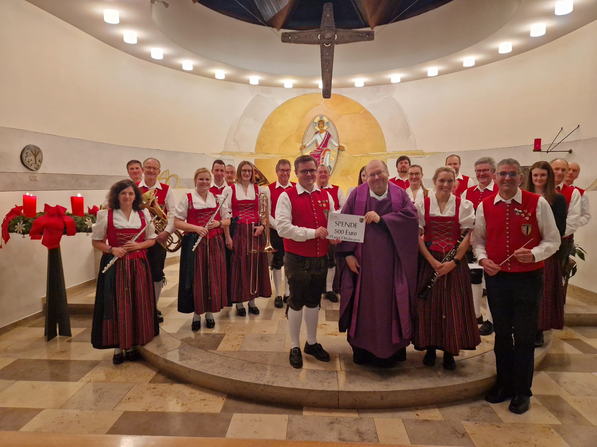 Im Rahmen des Krankenhausspielens wurde auch eine Spende in Höhe von 500,00 € aus den Einnahmen des Kirchenkonzerts 2023 an die Pfarrgemeinde Ottobeuren übergeben. Entgegen nahm sie stellvertretend für die Pfarrei Pfarrer Pater Beda Lange OSB.